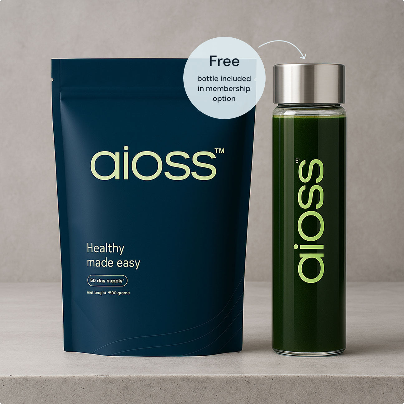 aioss is an all-in-one supplement solution with many benefits in one product. A pouch contains 30 servings of 12 grams each. Add a scoop to your bottle, shake, and drink.