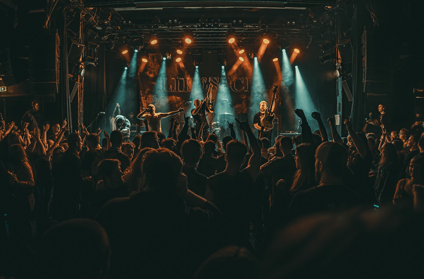 • Group of people with arms raised in a modern building with colorful spherical lights.
