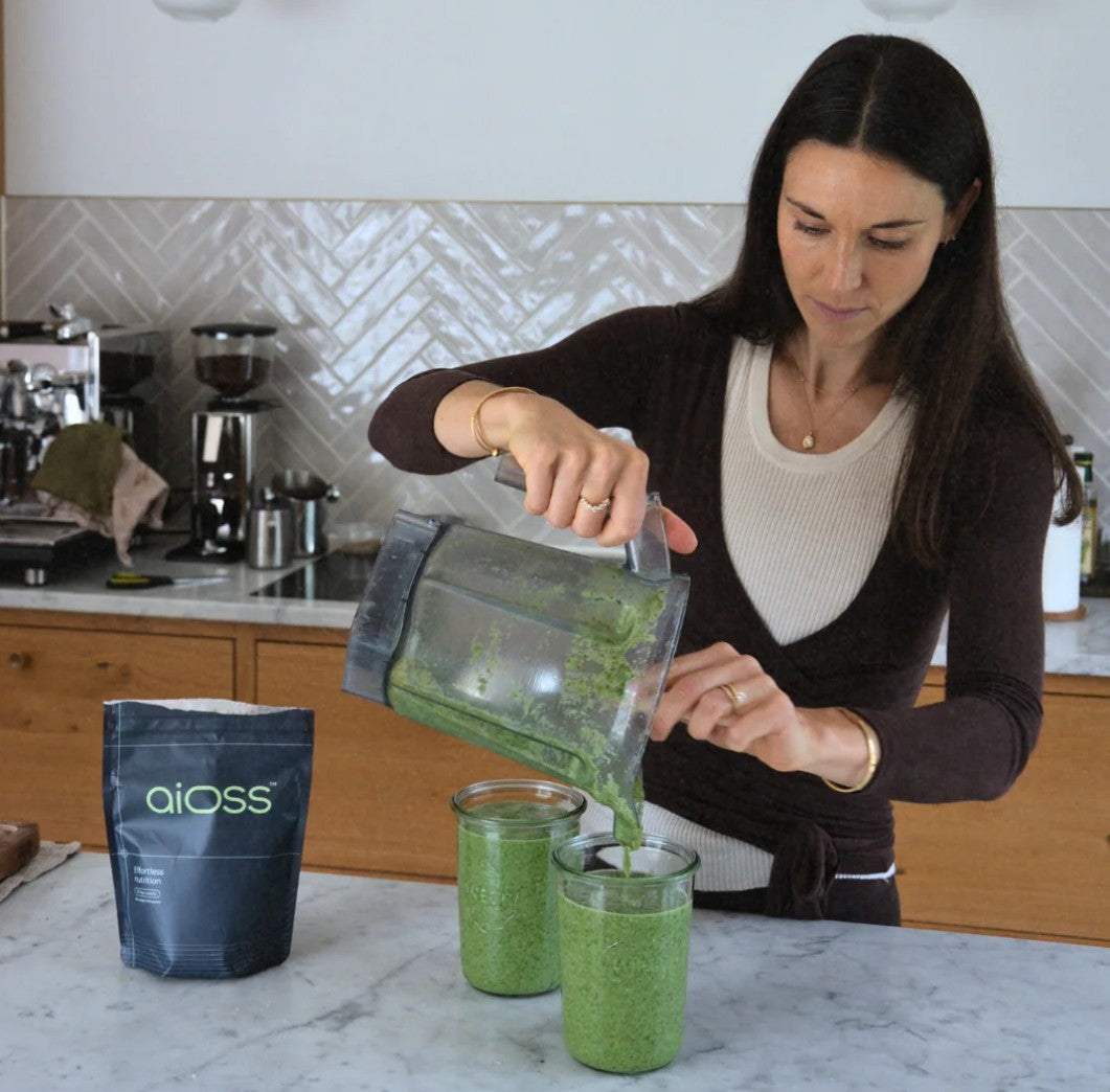 “It’s not pretty, but it works: frozen spinach, broccoli, parsley, blackcurrants, kiwi, bean sprouts, lemon, ginger, seaweed, walnuts, fish oil – and always a scoop of aioss. It gives me peace of mind to know that I’ve filled my body with something good before the day begins.”
