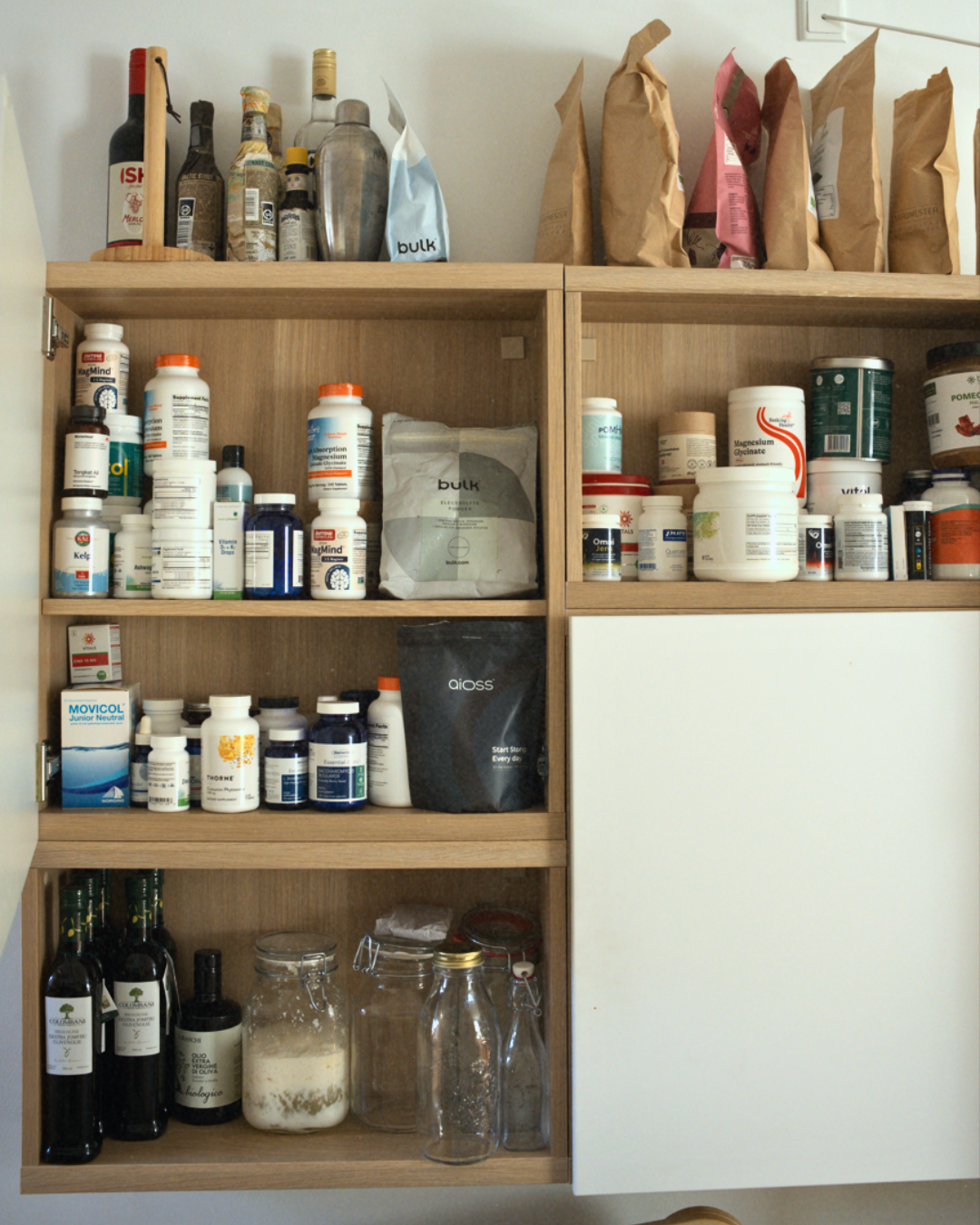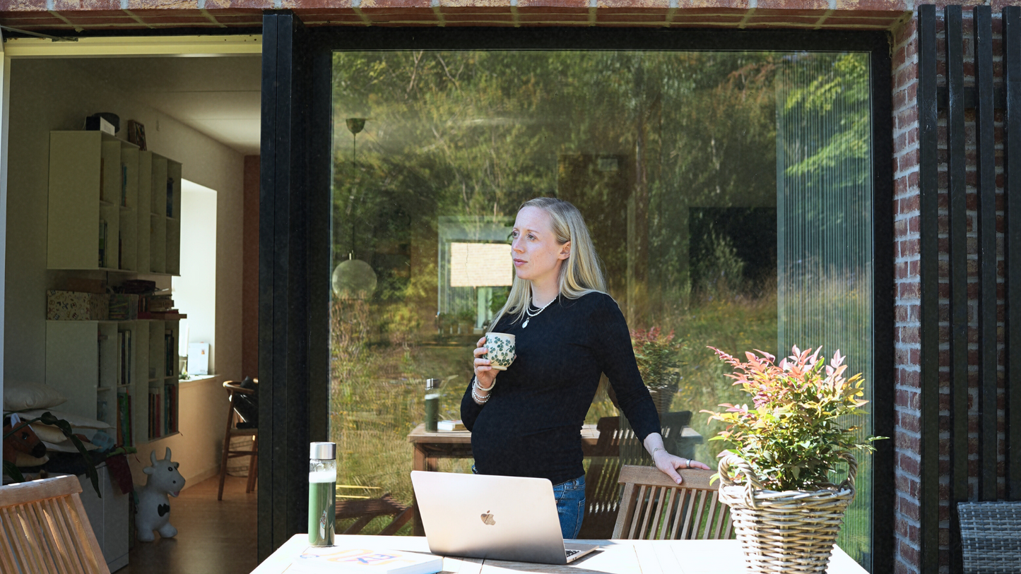 The day begins with fresh air, daylight through an open window, and a glass of water. Then comes a solid breakfast, often a smoothie made with leftover greens from the day before, berries, avocado, seeds, and supplements like collagen, pre- and probiotics, fish oil, or cod liver oil. In about 70% of cases, aioss is also part of the recipe.